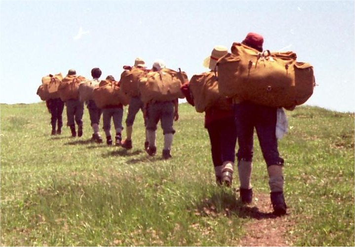 当時は,ニコヨンとかシャクハチとか呼んでいました.正式には2尺4寸(80cm) と1尺8寸(60cm)で, キスリングの口の横幅です.それにYWVのマークを張って使っていました. ニコヨンには十貫(37.5Kg)以上詰め込んでいました. この横幅ですと,当時の列車の入口からまっすぐに中に入れません. ですから 体を横にして横歩きで中にはいりました. このために「カニ族」とか「ヨコバイ族」と呼ばれていました.